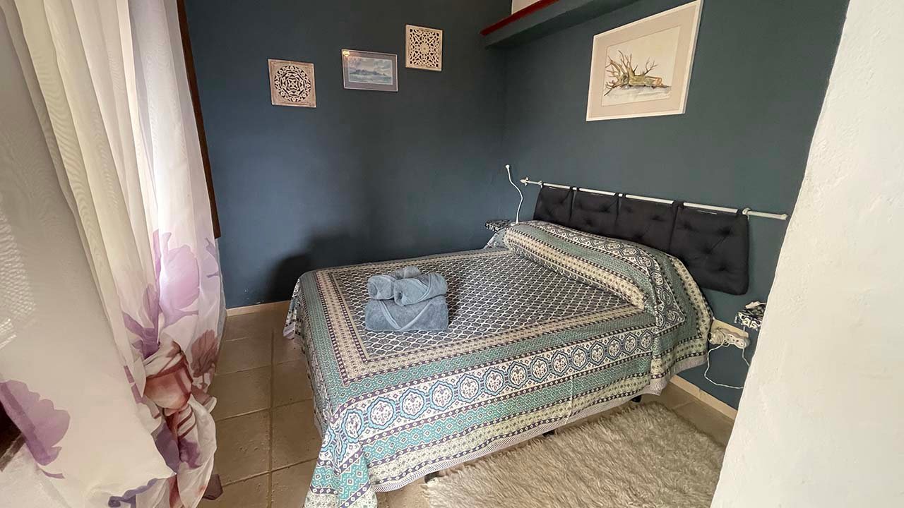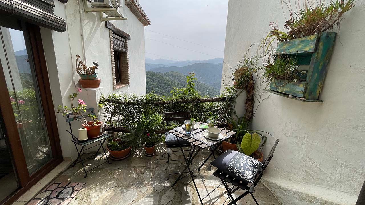 Casa en planta baja con un pequeño jardín, una terraza con vistas al valle del genal, un dormitorio con cama de matrimonio y un salón cocina con tres sofás-cama. Esta casa forma parte de una villa con dos apartamentos que se pueden alquilar de forma independiente